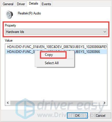 - 하드웨어 ID 목록이 표시되면 더 짧은 것을 마우스 오른쪽 버튼으로 클릭하고 복사 . 그런 다음 쉽게 얻을 수 있는 곳에 붙여넣습니다.