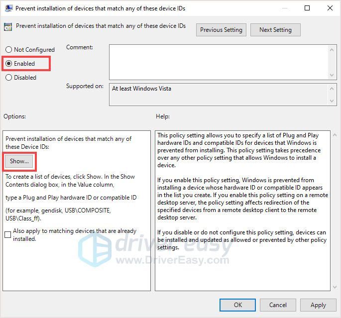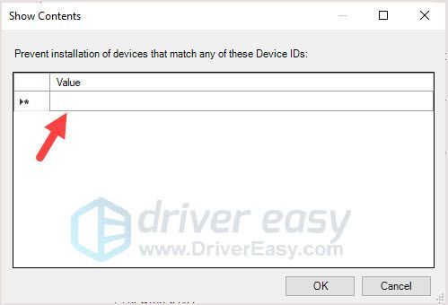 - 마우스 오른쪽 버튼으로 클릭 이러한 장치 ID와 일치하는 장치 설치 방지 오른쪽 패널에서 편집하다 .