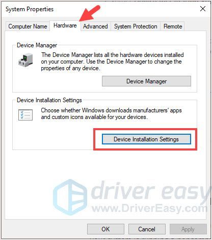 - 에서 하드웨어 탭, 클릭 장치 설치 설정 .